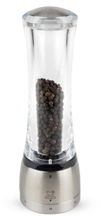 Deze Peugeot pepermolen 'Daman' is gemaakt van acryl en roestvrij staal. Het acryl is extra versterkt omdat er geen as in het midden van de molen zit. Onder de magnetische dop op de bovenkant is veel ruimte om het peper en zout bij te vullen.