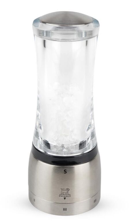 Deze Peugeot zoutmolen 'Daman' is gemaakt van acryl en roestvrij staal. Het acryl is extra versterkt omdat er geen as in het midden van de molen zit. Onder de magnetische dop op de bovenkant is veel ruimte om het peper en zout bij te vullen.