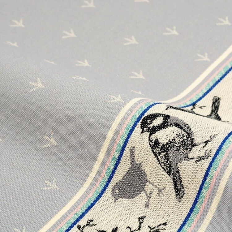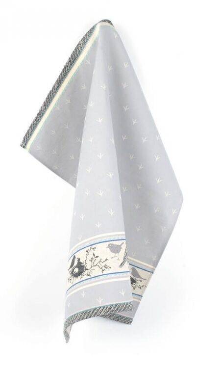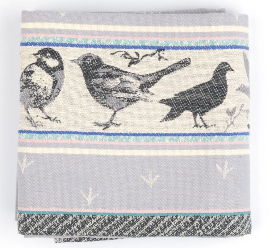 Bunzlau Castle grijze theedoek met vogel print en groene en roze details.