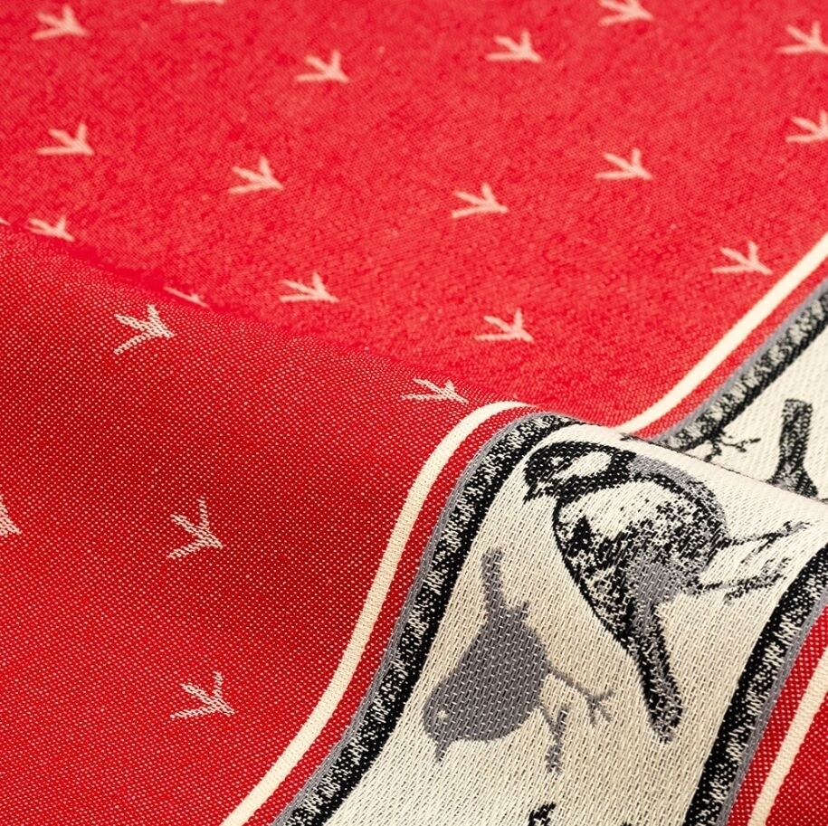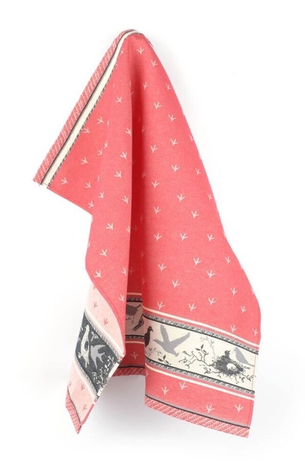 Bunzlau Castle rode theedoek met vogel print en witte en grijze details.