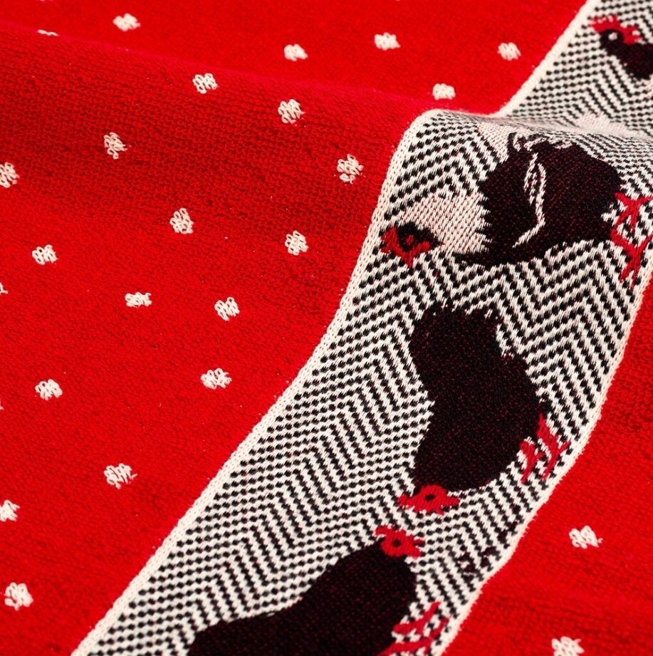 Bunzlau Castle rode keukendoek met kippenprint en witte details.