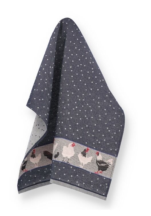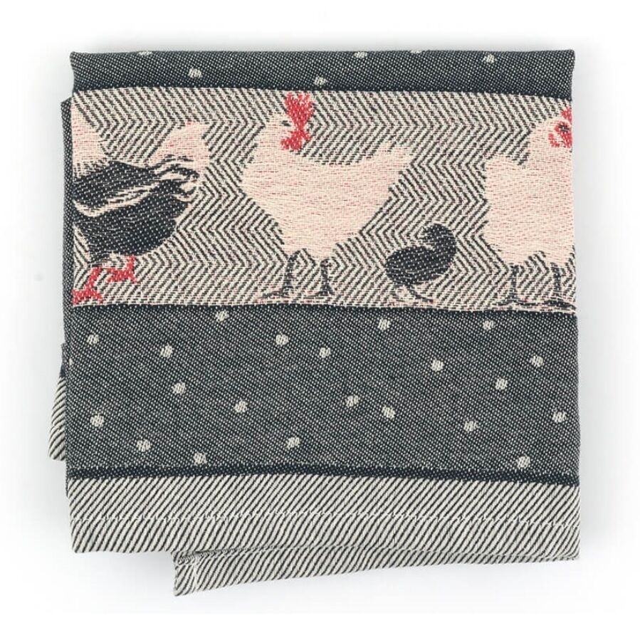 Bunzlau Castle zwarte theedoek met kippen print en witte details.