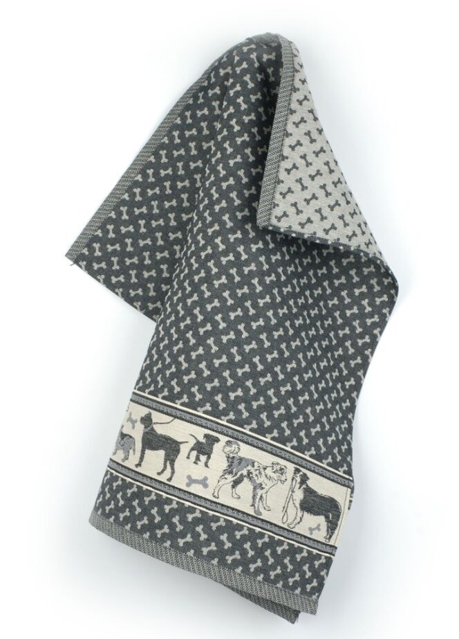 Bunzlau Castle zwarte theedoek met honden print en witte details.