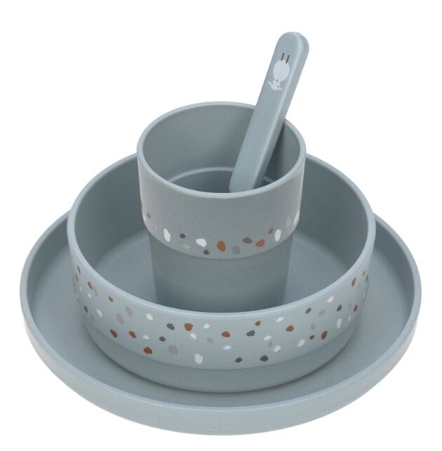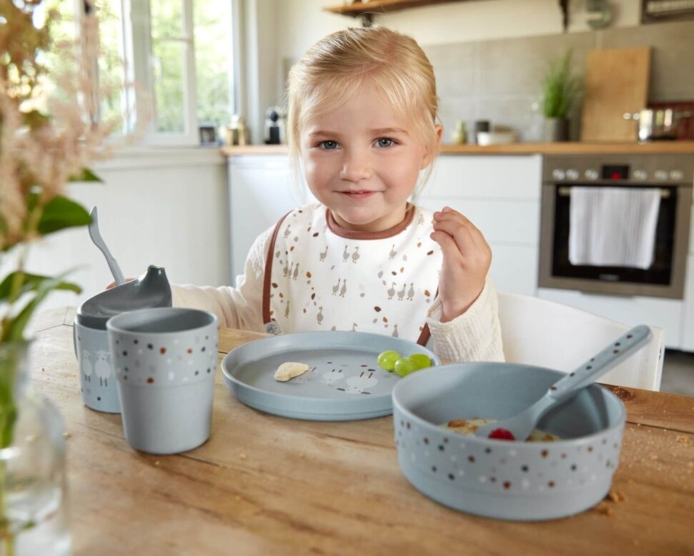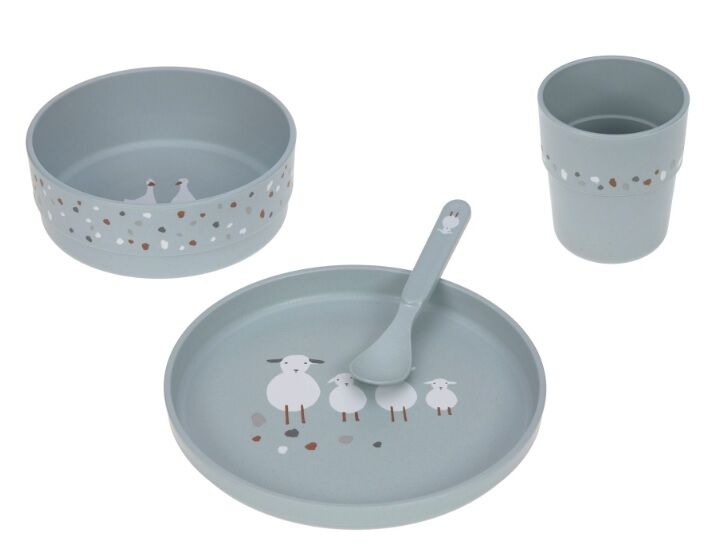 Kinderserviesset (bord - kom - beker - lepel) – Tiny Farmer Schaap & Gans, Blauw