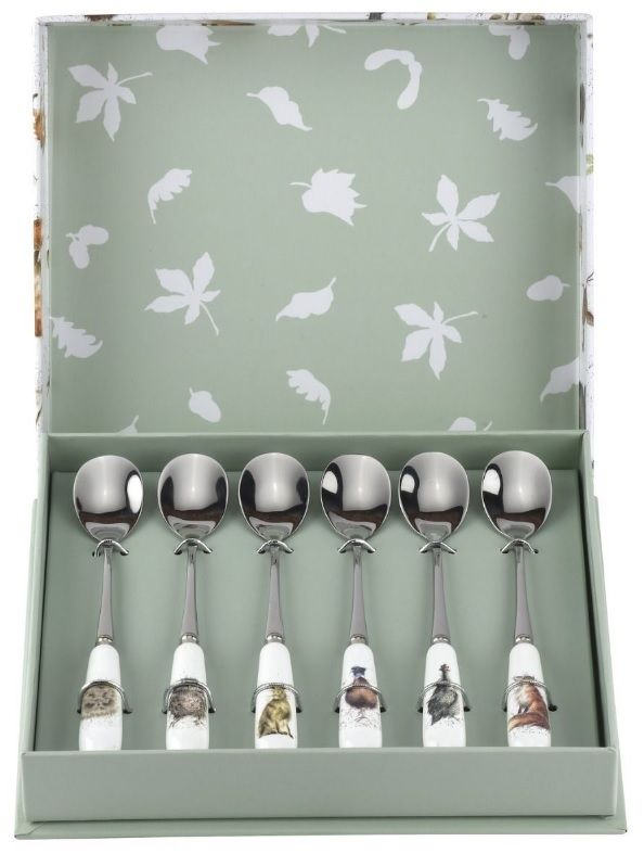 Set van 6 theelepels. Bovenzijde van metaal en het handvat is porselein en versierd met 6 verschillende diermotieven. Goed te combineren met het Wrendale servies.
