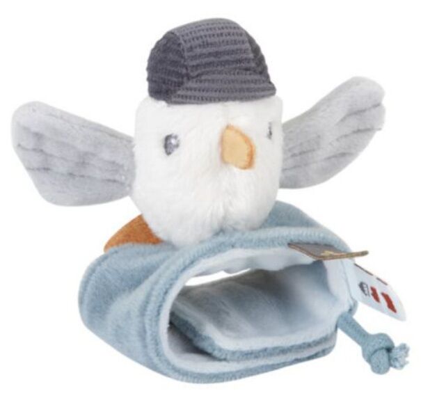 De rammelaar is een vrolijke en knuffelbaar meeuwtje en kan vastgemaakt worden met klittenband om de arm van uw kindje. Bij bewegen klinkt een vrolijk gerammel.