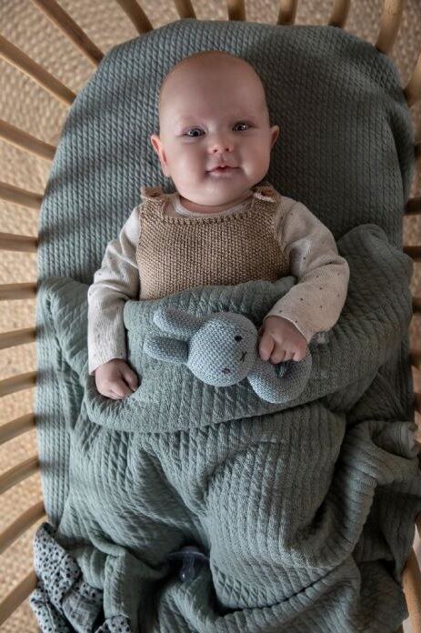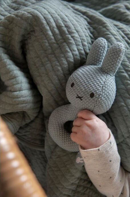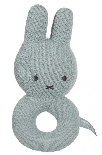 Heerlijke zachte mintgroen gebreide knuffeltje van Nijntje met rammelkraaltjes erin en eenzelfde gebreide ring om vast te houden.