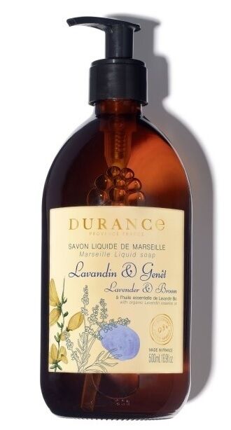 Durance Lavandin & Genet vloeibare marseille zeep voor lichaam en handen in glazen zeeppomp. De zeeppomp bevat 500ml.