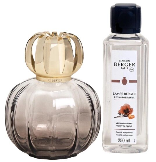 Deze bijzonder gedecoreerde Lampe Berger Corali Grise, valt op door het verfijnde ontwerp van 'De Vog'. Het glas met de royale vormen, een mooi kleurverloop en verticale reliëfdetails past in elk interieur. De glanzend goudkleurige ronde sierdop geeft de lamp een moderne uitstraling.