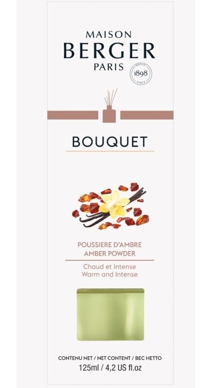 Maison Berger Paris Huisparfum Amber Powder: Deze sensuele geur begint discreet met een licht akkoord van roos en kaneel en biedt dan een hart van amber en patchouli om vervolgens expressie te geven aan een fascinerende grondtoon van vanille en witte musk.