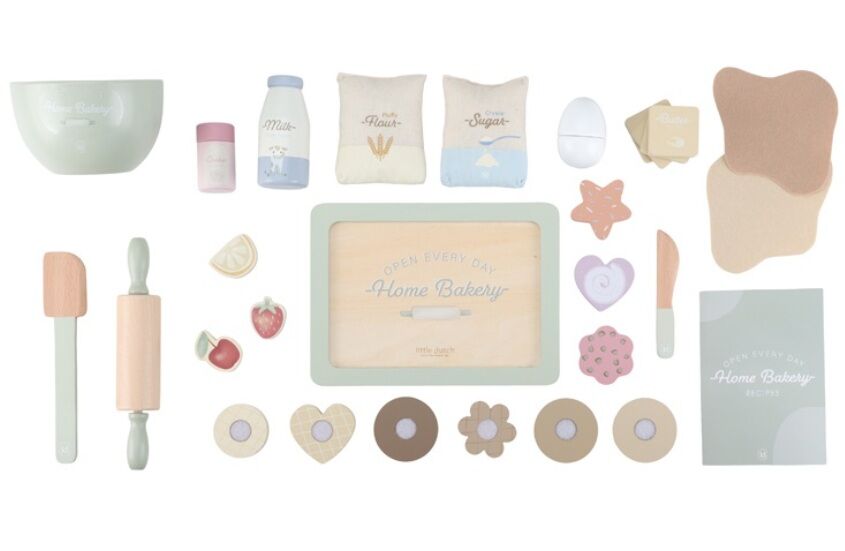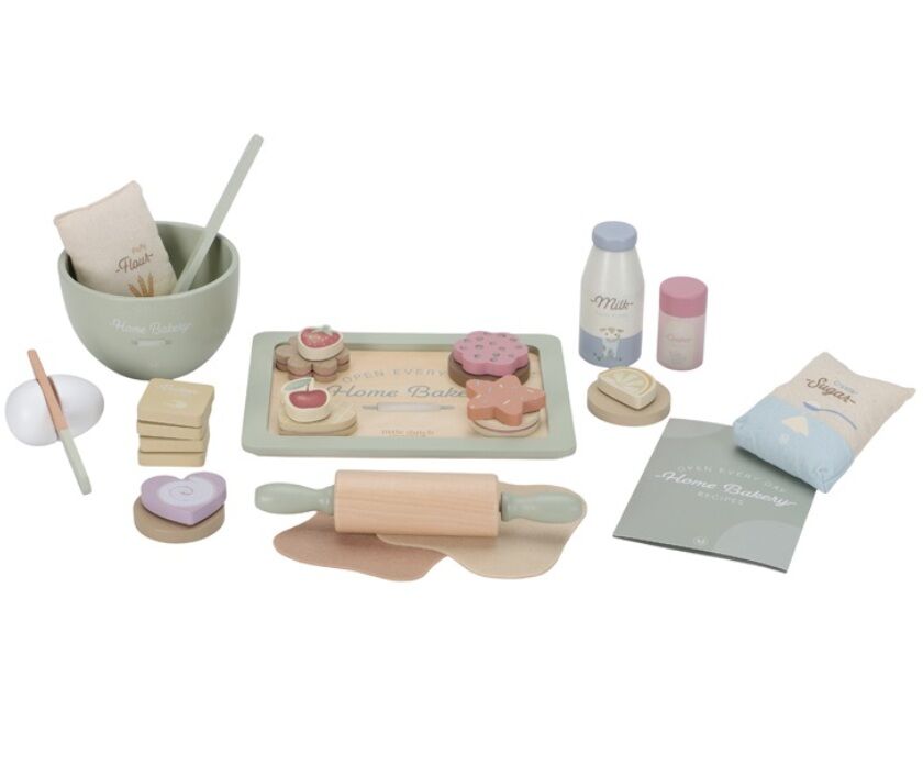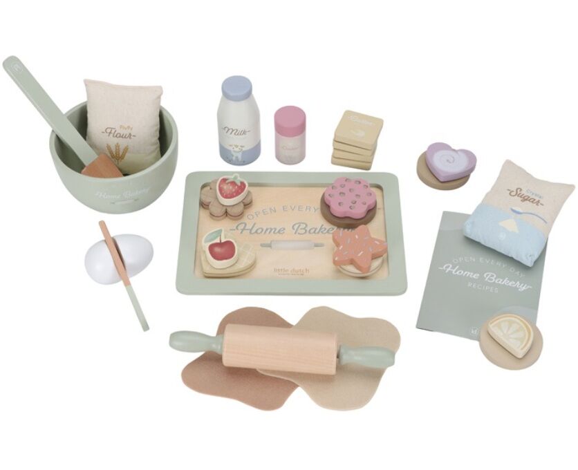 Dit leuke houten bakset van Little Dutch bestaat uit een bakplaat, beslagkom, deegrol, pannelikker, mes en verschillende ingredienten, koekjes en versieringen.