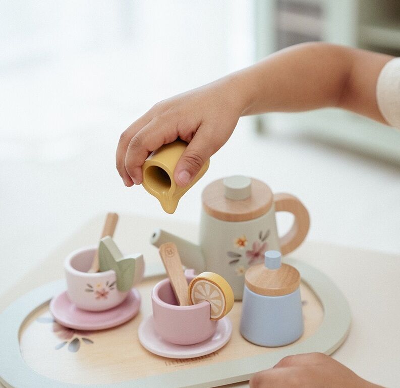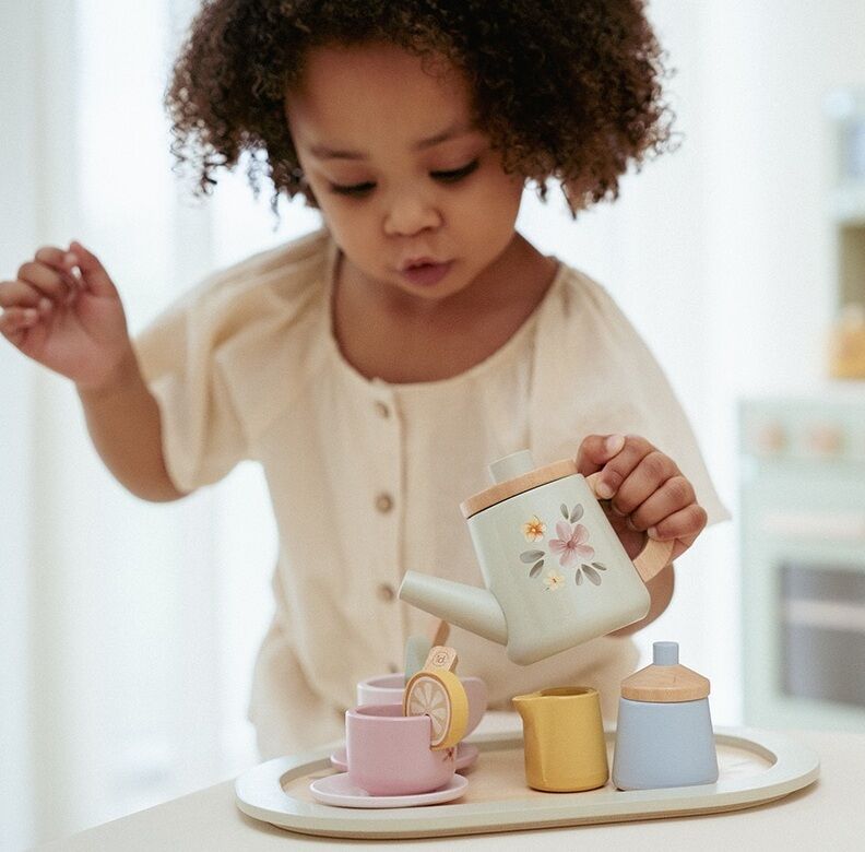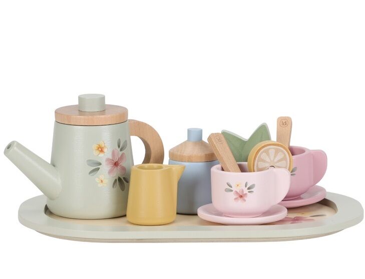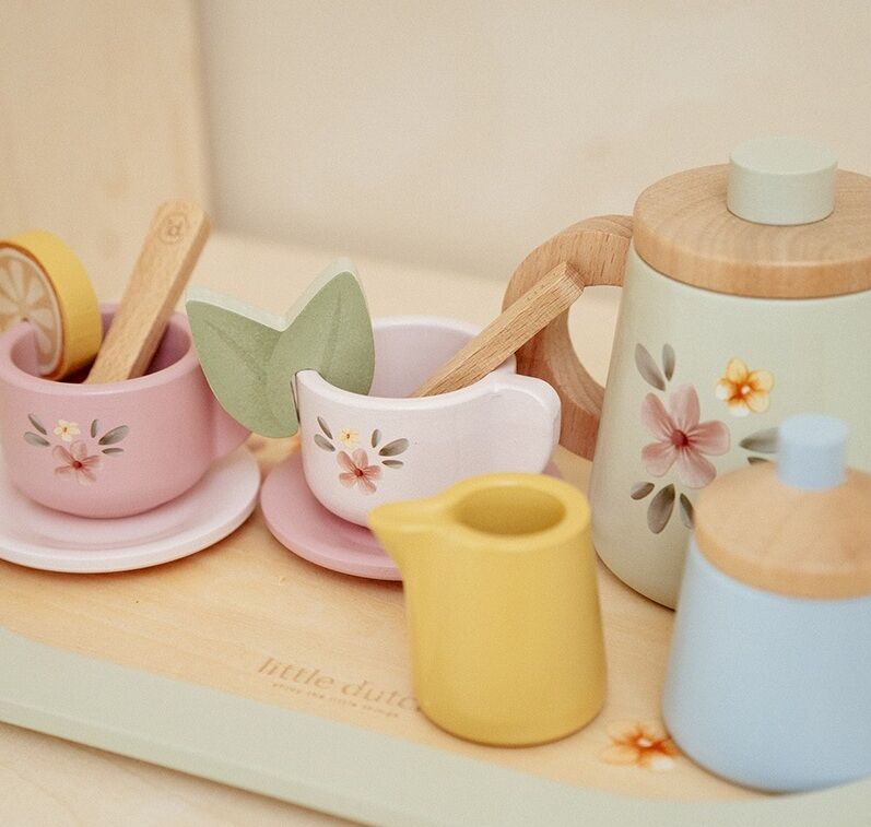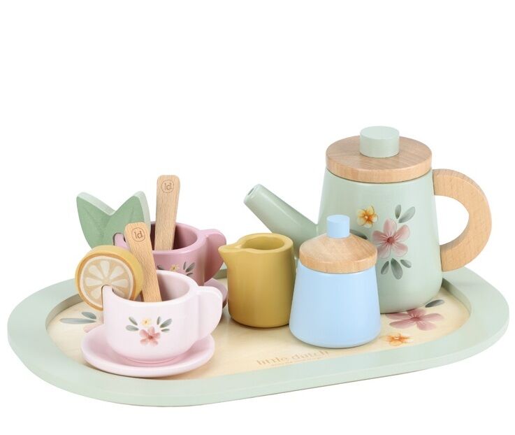Met dit prachtige houten theeservies van Little Dutch, gedecoreerd met mooie bloemetjes, kan je kleintje eindeloos thee en koffie schenken in de kopjes, met suiker en melk, of liever met een schijfje citroen of takje munt?