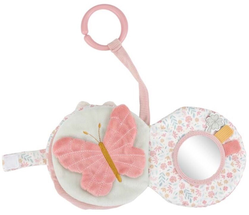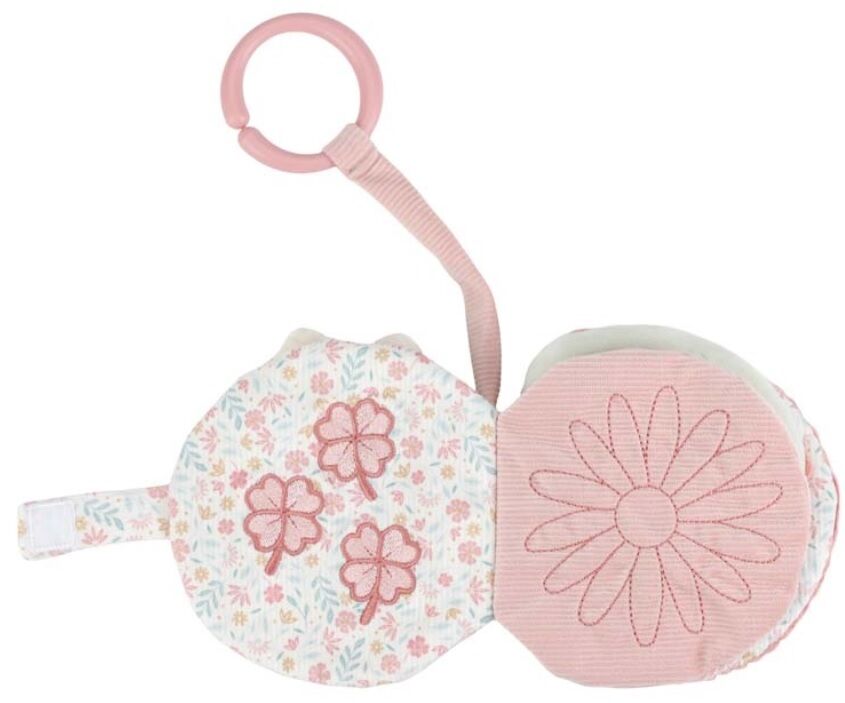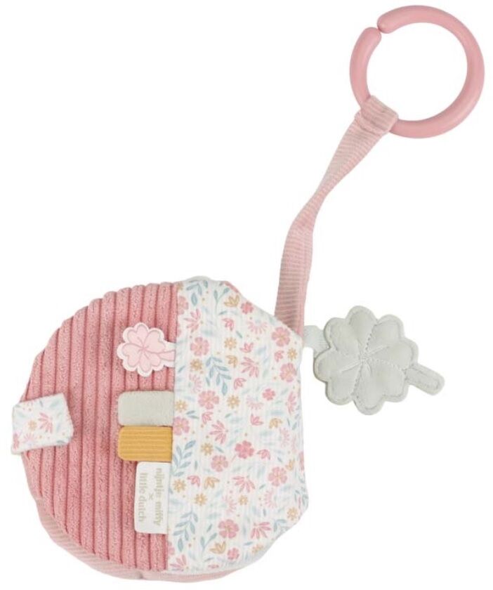 Het boekje is voorzien van leuke labels, spiegeltje, belletje en verschillende texturen aan stof wat goed is voor de zintuigen. Bevestig het aan de buggy of wandelwagen voor speelplezier onderweg.