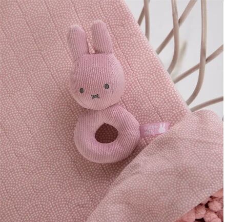 Heerlijke zachte roze stoffen knuffeltje van Nijntje met rammelkraaltjes erin en een stoffen ring om vast te houden.