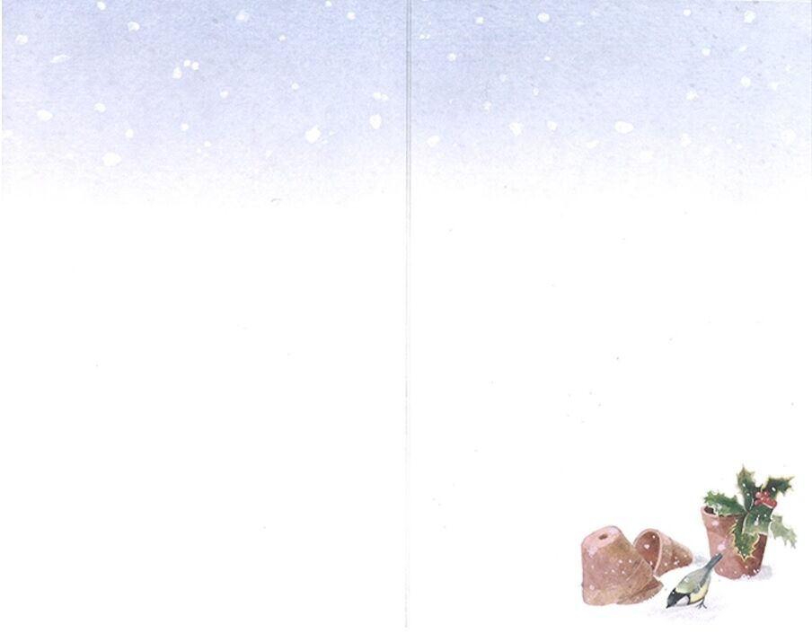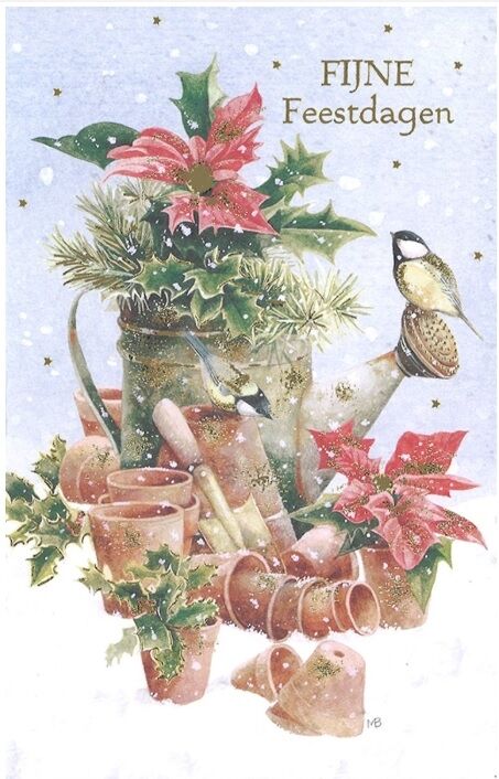 Doosje met 10 prachtige Kerst-wenskaarten koolmeesjes met gieter en bloempotten, met envelop van Marjolein Bastin