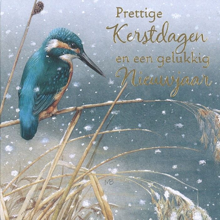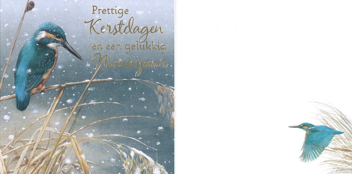 Doosje met 8 prachtige Kerst-wenskaarten met een IJsvogel op besneeuwde rietstengels, met envelop van Marjolein Bastin