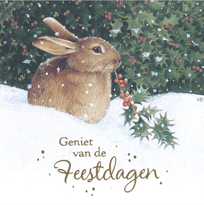 Doosje met 8 prachtige Kerst-wenskaarten met Konijntje in de sneeuw voor een hulststruik, met envelop van Marjolein Bastin